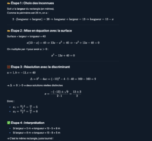 Un rectangle a un périmètre de 26 mètres et une surface de 40 m².
